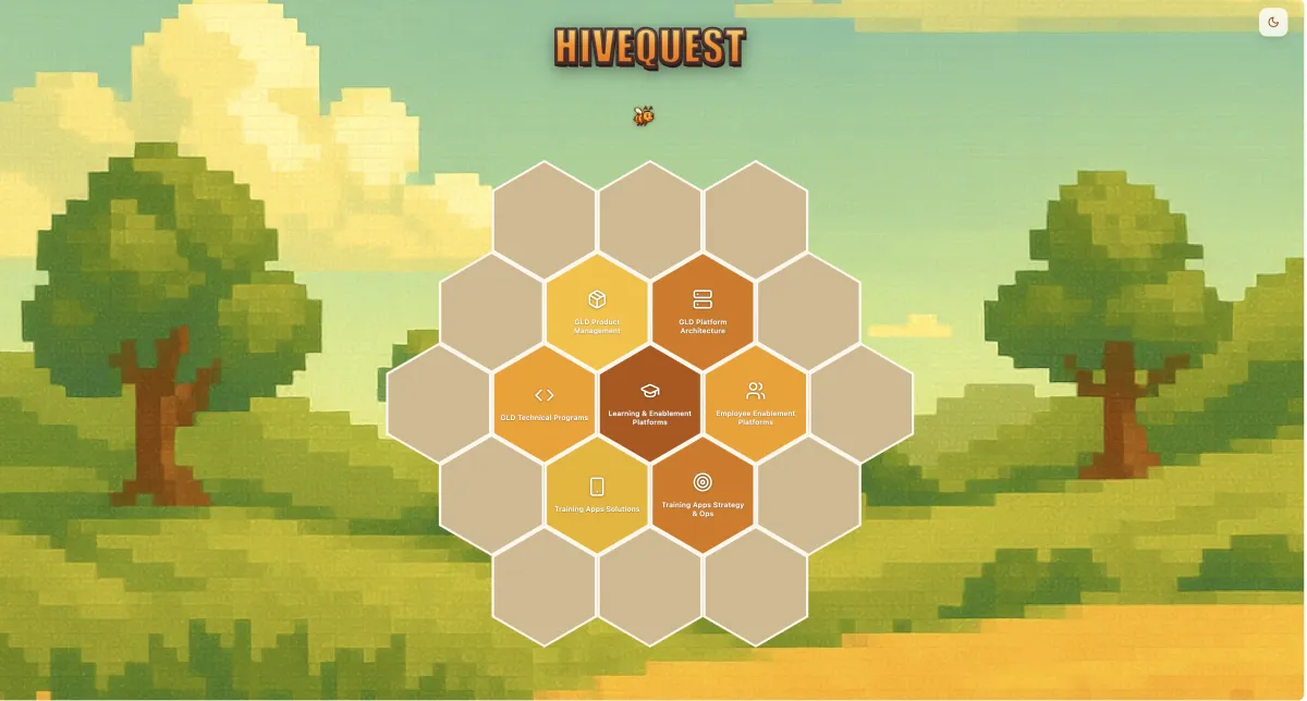 I designed and built HiveQuest, a gamified experience to drive cross-functional collaboration across ServiceNow’s Global Learning & Development organization. The game uses a central honeycomb map as the “world hub,” with interactive team hives serving as “level portals.” A custom bee sprite with flight and hover dynamics acts as the player avatar, enabling exploration through click-to-enter mechanics. HiveQuest layers in video game elements such as environmental pixel-art landscapes, title-screen branding, interactive modals as “quest pop-ups,” and progression pathways that mirror RPG exploration. By framing team structures in a playful arcade-style interface, HiveQuest transforms organizational knowledge-sharing into an engaging and memorable player journey.